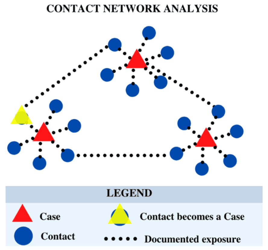 The graphic below depicts three (3) cases (triangle/red), with identified contacts (circle/blue), and their exposure pathways. The yellow triangle overlapping the circle represents a contact who, after being identified through contract tracing, was confirmed as a new case. Thus, there are 4 total cases identified on the graphic.