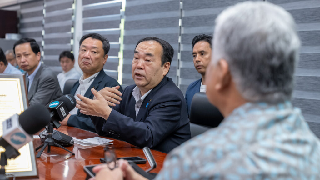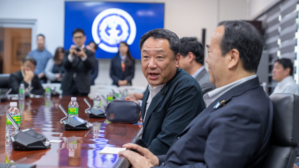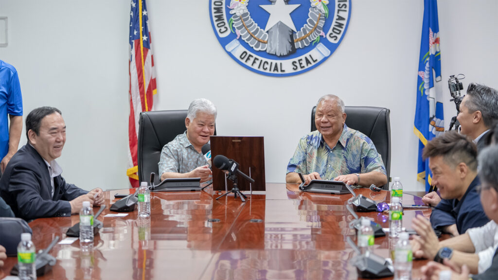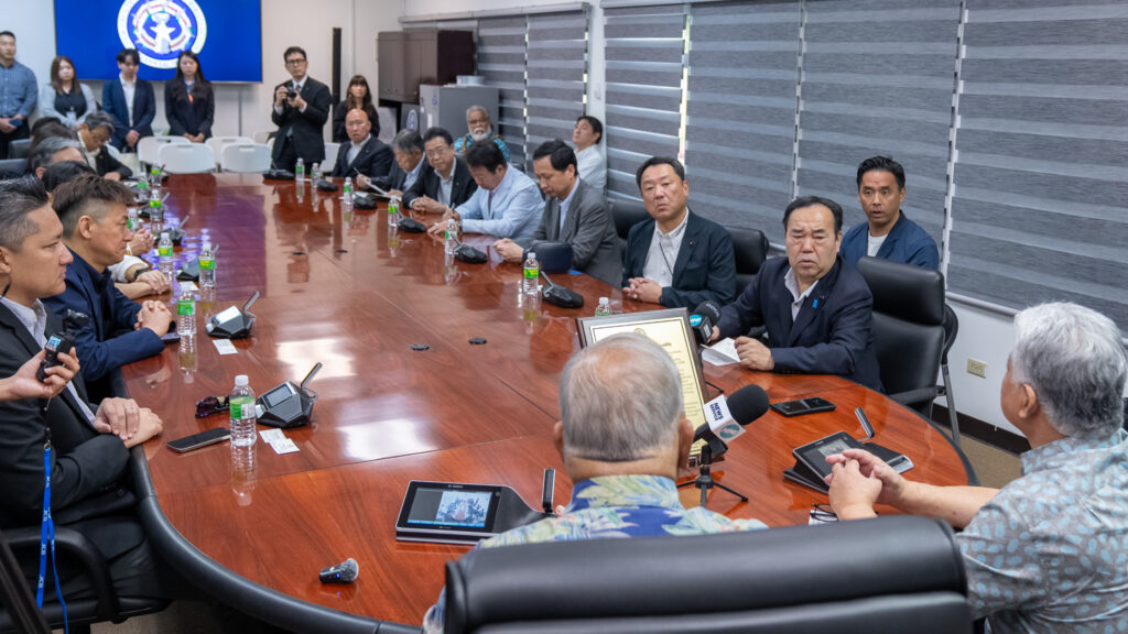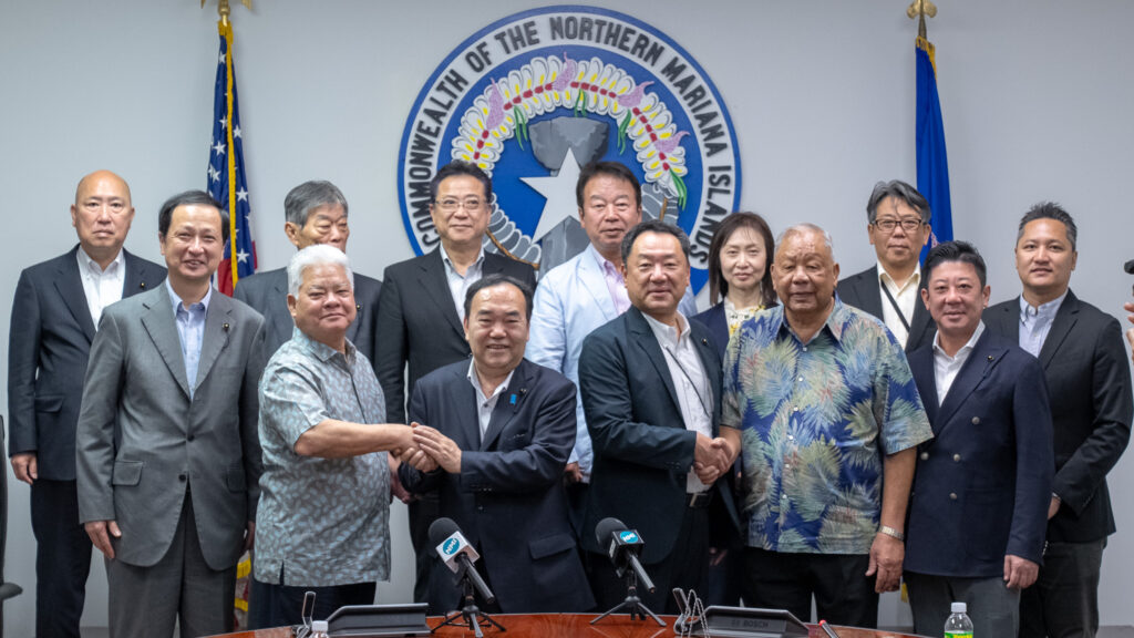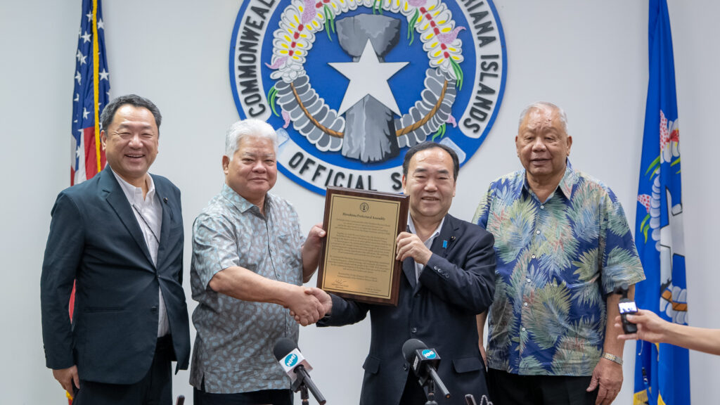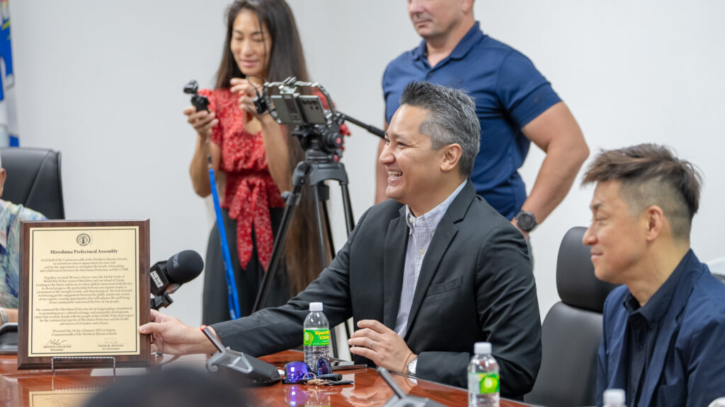 A meaningful reception as Governor Arnold I. Palacios and Lieutenant Governor David M. Apatang welcome the Hiroshima Prefectural Assembly to the CNMI. This meeting reflects the enduring strength of unity, resilience, and the shared commitment to peace.